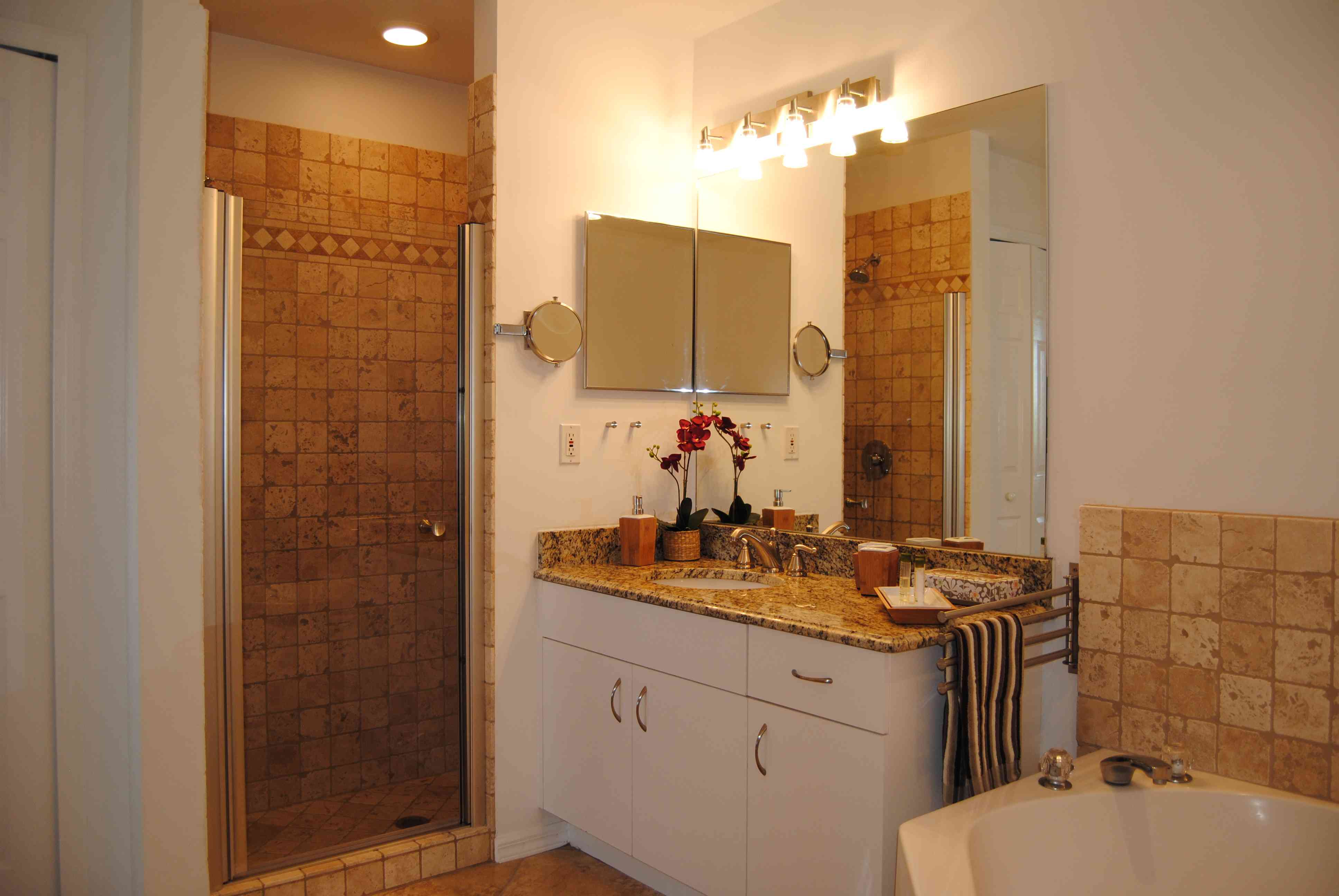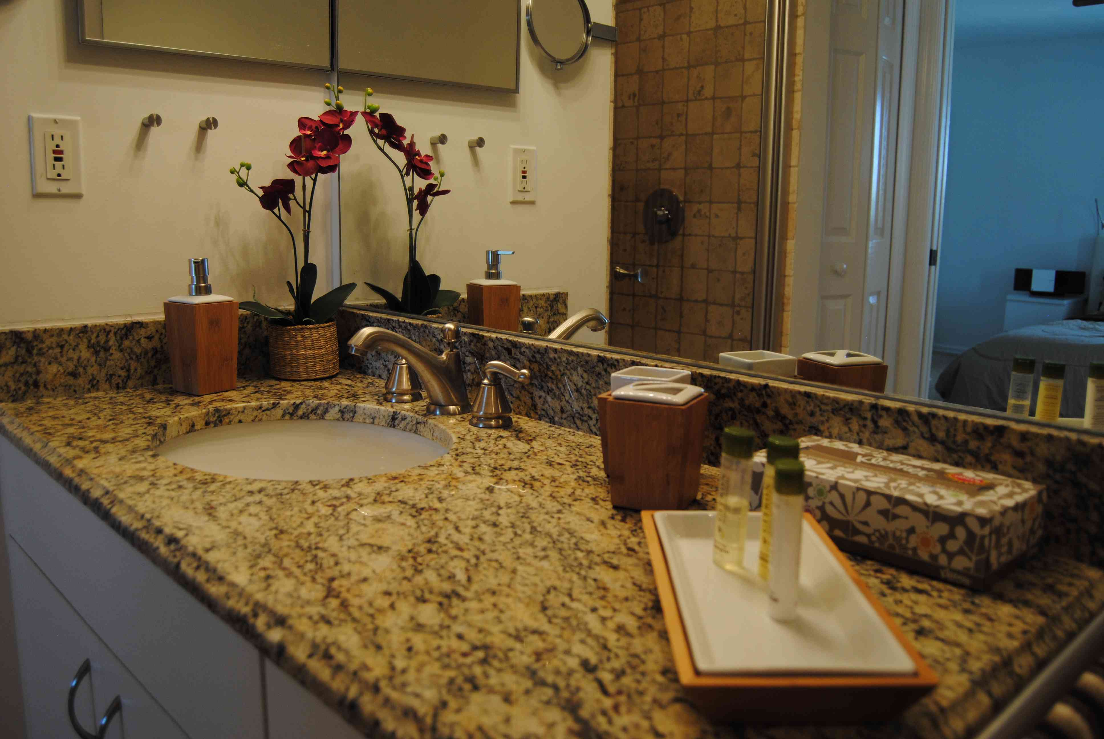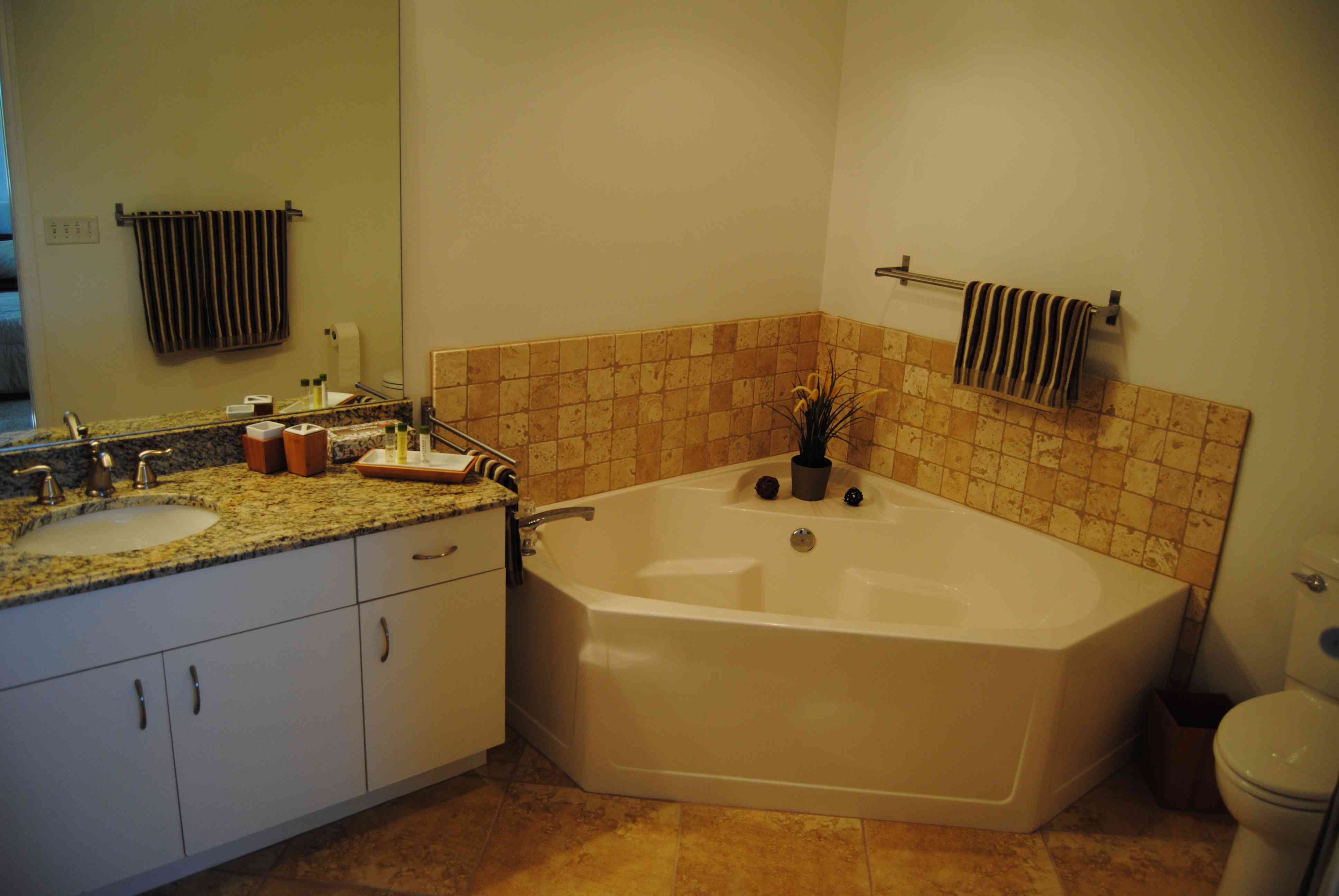 Das Masterbad umfasst eine mit italienischem Travertine neugestaltete Dusche nebst Grohe-Armaturen, eine große Badewanne, Toilette und einen Granitwaschtisch. In dem Unterbauschrank finden Sie neben Hand- und Duschtüchern auch Strandtücher für Ihren Ausflug nach Sanibel Island ...