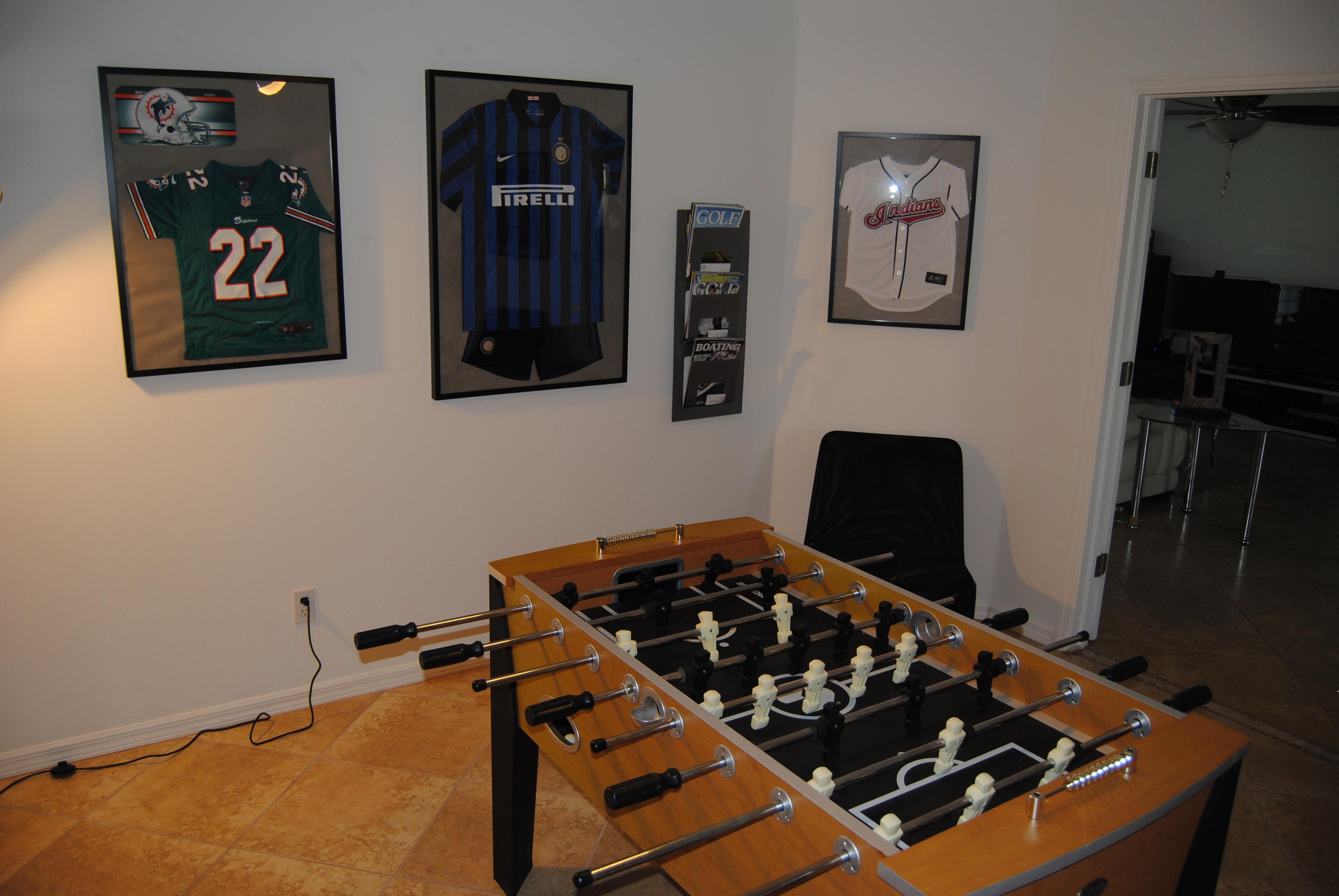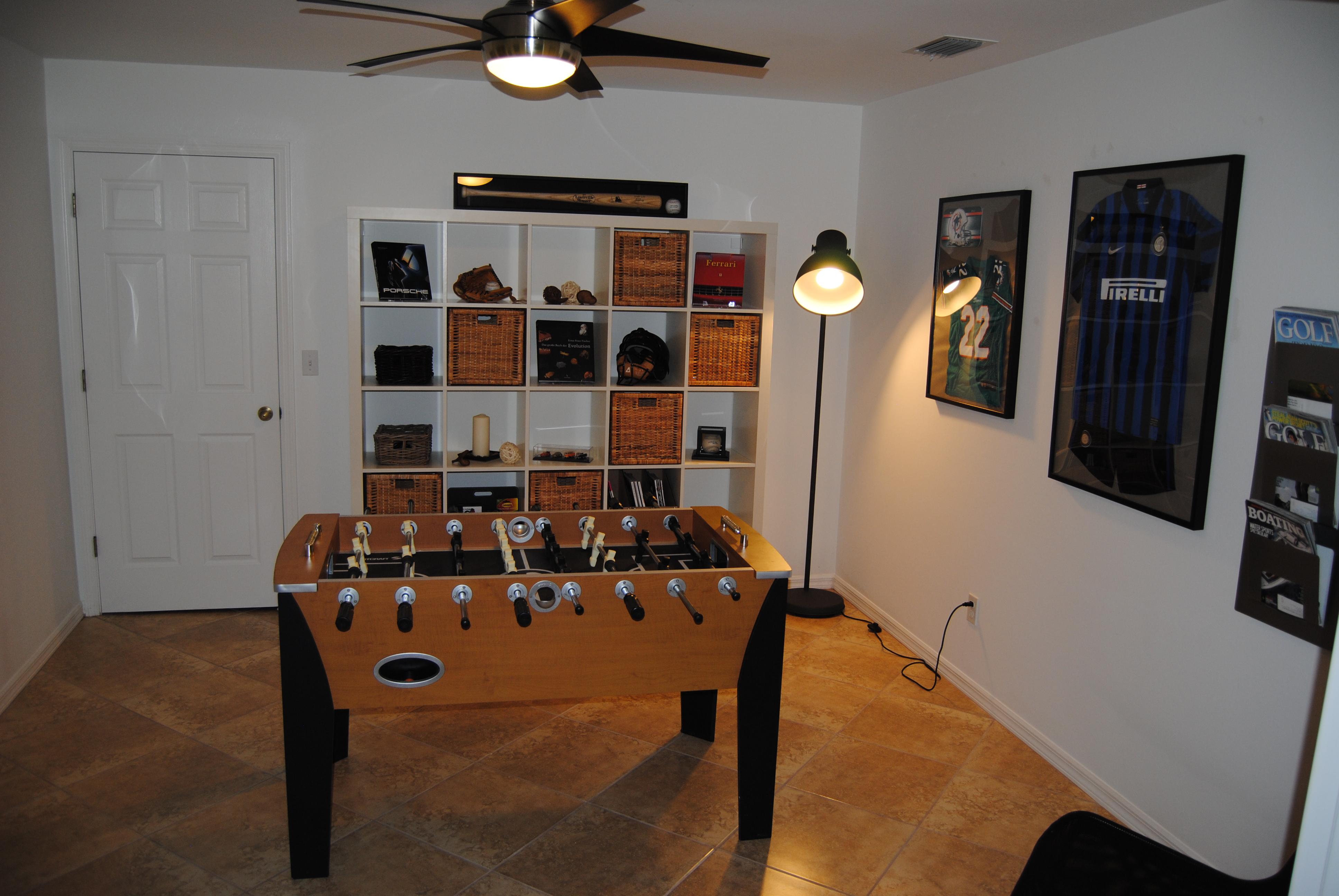 Das Spielzimmer (Den) in der Mitte des Hauses ist mit einem robusten Tischkicker ausgestattet und liebevoll mit verschiedenen Sportutensilien und Trikots dekoriert. Darüber hinaus finden Sie in der Regalwand verschiedene Karten- und Gesellschaftsspiele, Bildbände, zwei Navigationssysteme zur kostenfreien Nutzung in Ihrem Mietwagen ..... Ein Zimmer nicht nur für die jungen Gäste !!!